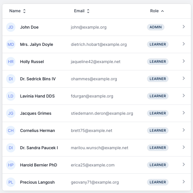 - You can choose between admin and learner role when the user is added. Admins can manage everything and learners can only see courses.